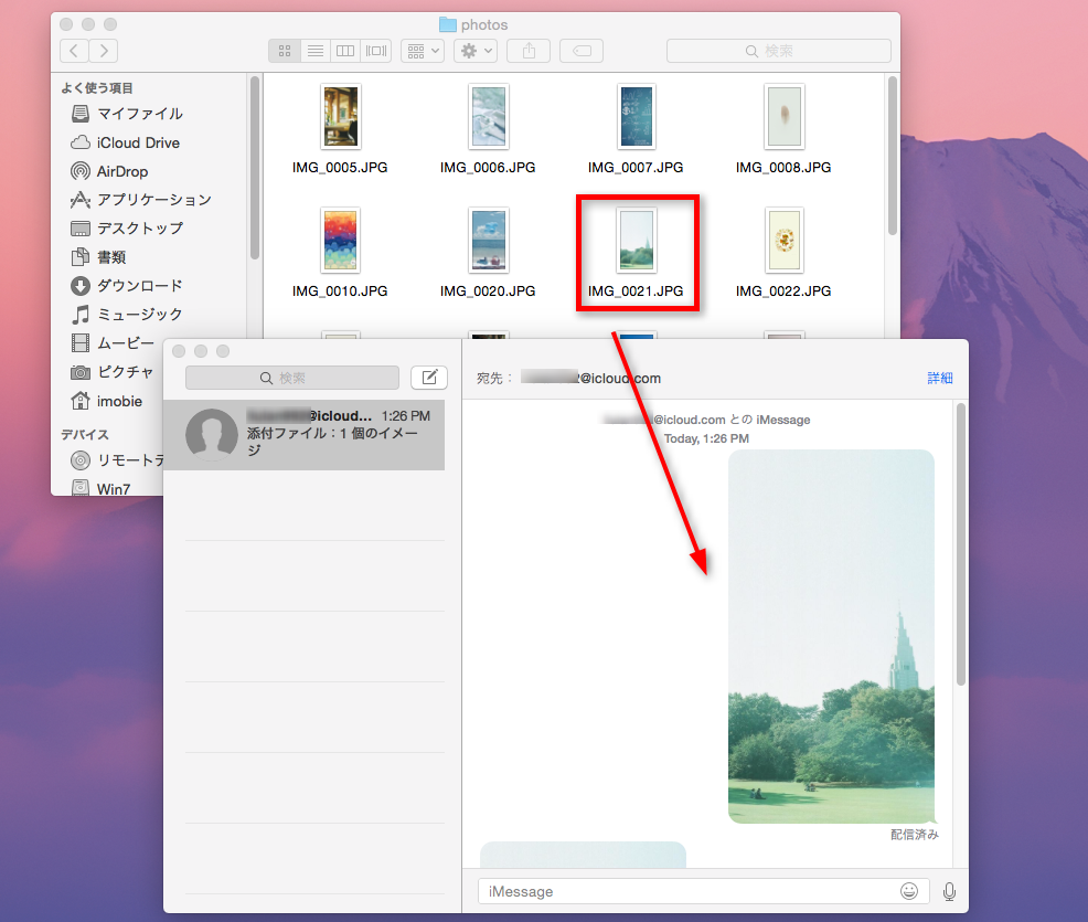 Macに戻り、メッセージアプリ開き、自分に送信したiMessageの写真を見ることができます。この方法は双方向操作にも適しています。つまり、MacからiPhoneに写真同期することもできます。